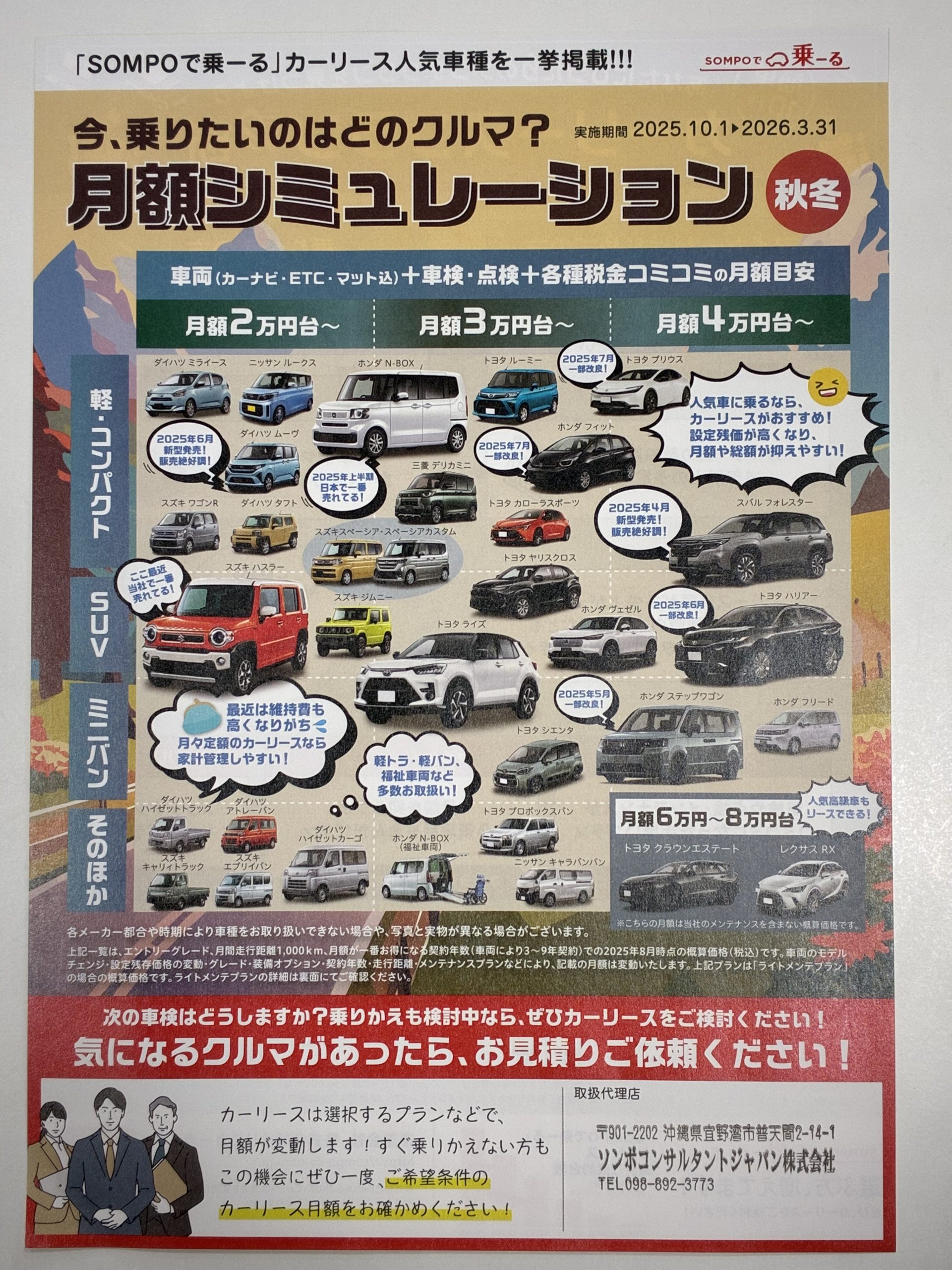 2025年10月7日 / 最終更新日 : 2025年10月7日 ソンポCJ SOMPOで乗ーる「月額シミュレーション」秋冬 『SOMPOで乗ーる』カーリース人気車種を一挙掲載!!! 気になるクルマがあったら、お見積もりご依頼ください!